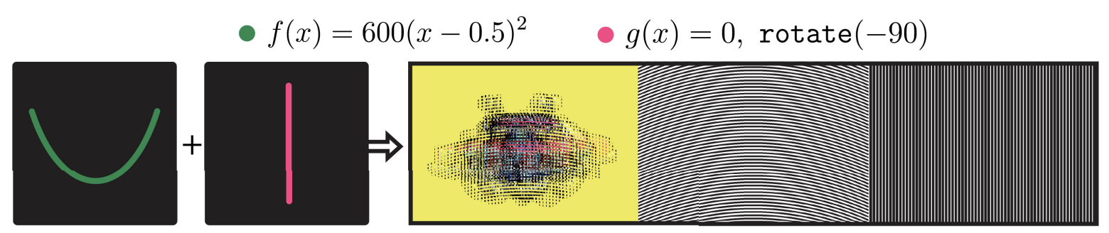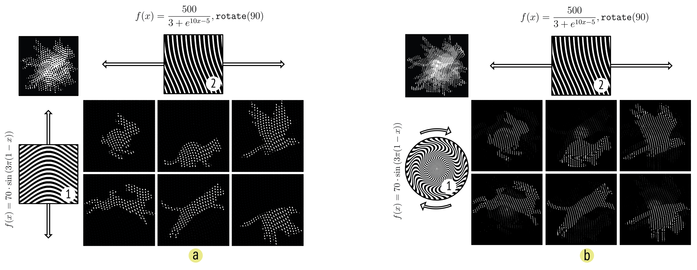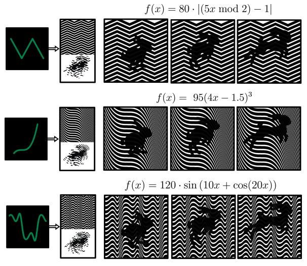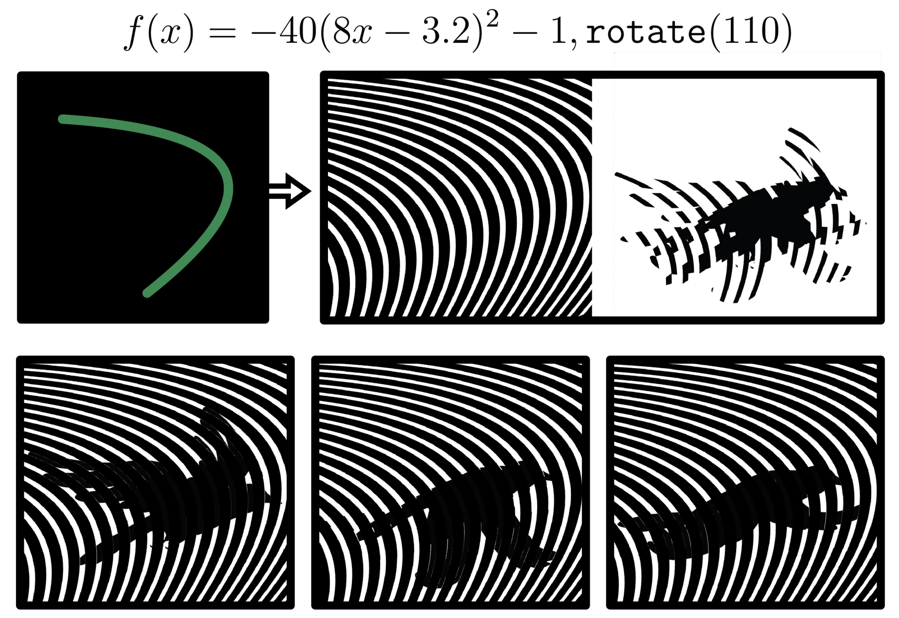 Our parameterization provides two key advantages over conventional methods for barrier-grid animation generation. First, it has a high expressive ceiling as it provides a framework for systematically generating entirely new forms with predictable behavior. Figure 9 shows several novel patterns alongside their corresponding functions, illustrating how different mathematical formulations extend the visual vocabulary of barrier-grid animations while preserving their core properties.