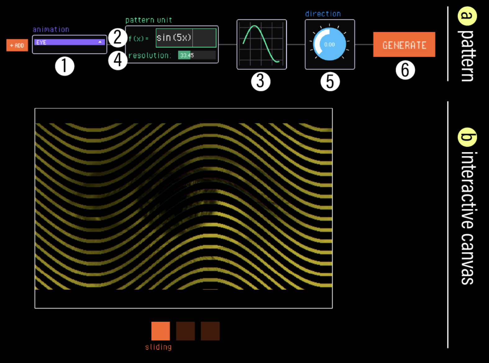 Consider Figure 12, which shows the main FabObscura interface. 1 To begin, the designer selects their animation sequence, which is a folder containing an image sequence of animation frames. The animation sequence serves as the visual content revealed through the barrier pattern. 2 As the designer enters the pattern unit function, 3 the interface updates a plot that visualizes the mathematical expression. This real-time feedback allows designers to develop intuition about how different functions map to visual outcomes. 4 Next, the designer can adjust the resolution of their animation. Lower resolution animations use coarser interlacing that requires larger movements to advance between frames, while higher resolution animations have finer interlacing that makes them more sensitive to movement. 5 Finally, the designer can specify the direction of motion by applying a rotation. 6 After confirming the pattern parameters, the system updates the interactive canvas with the animation and specified barrier pattern.