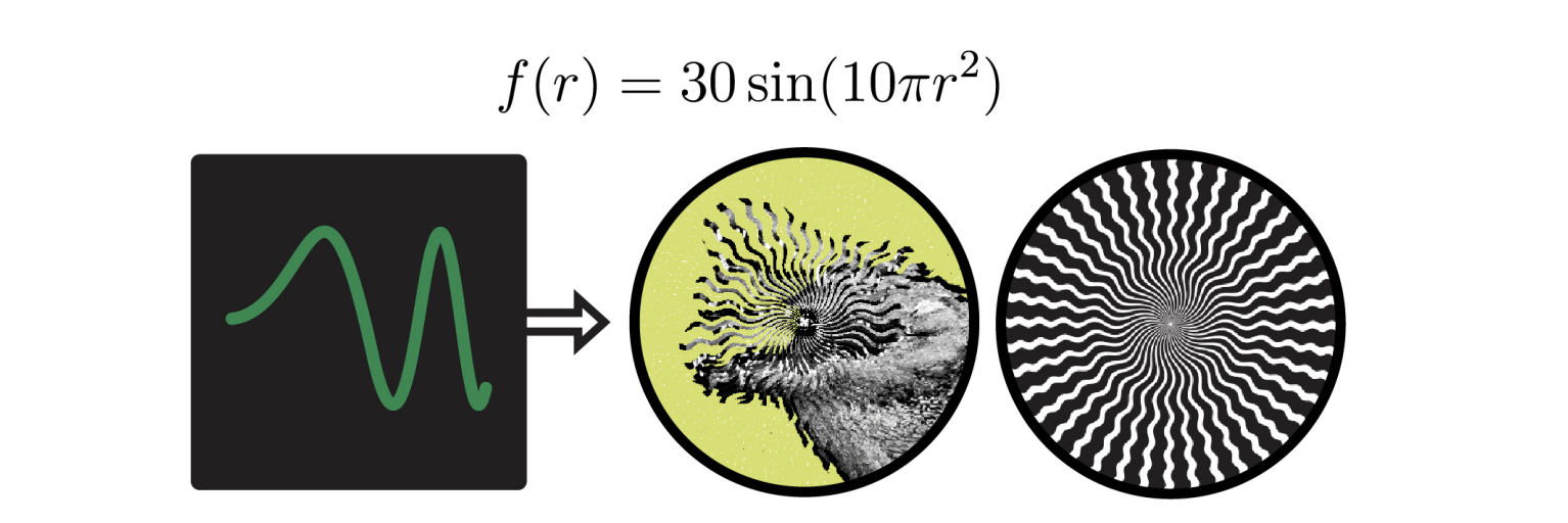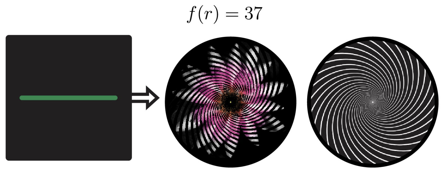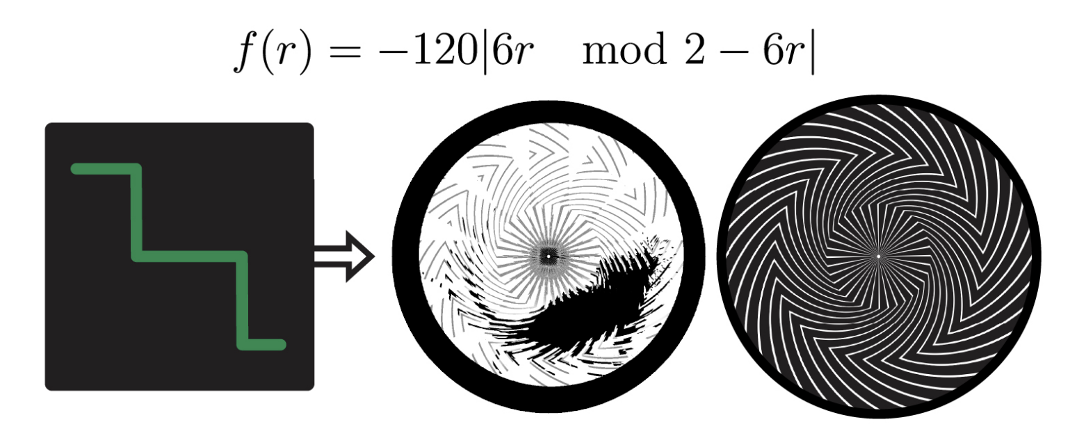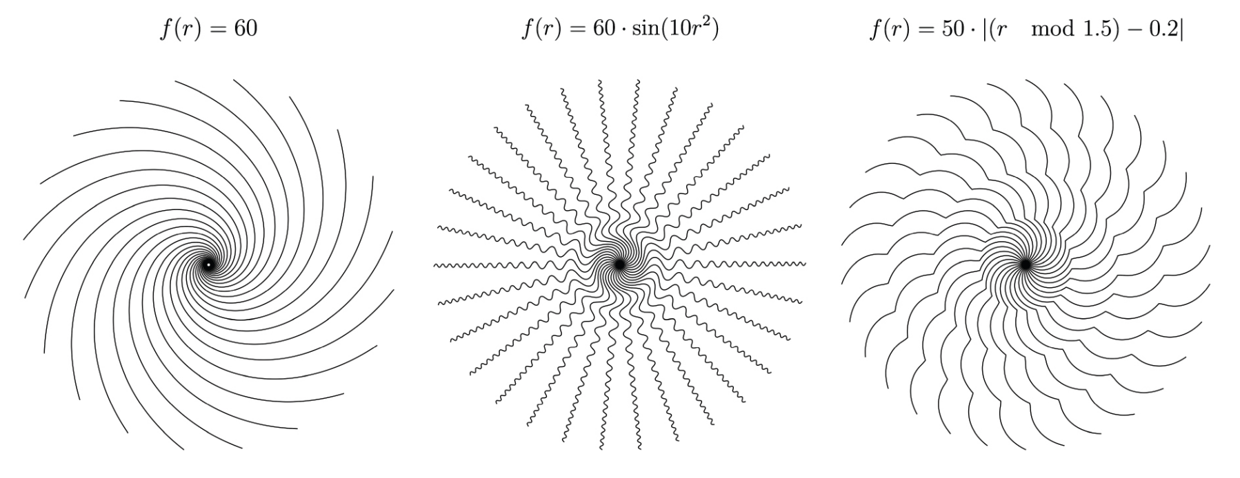 The same one-to-one mapping principle holds for rotational animations, though now expressed in polar coordinates rather than Cartesian space. In this framework, the path of each radial line in the pattern is governed by a function f that defines the local inclination (i.e., the turning angle) as a function of r, the radial distance measured outward from the center of rotation. As r increases, f(r) controls how much the line bends at each step (Fig. 7). For example, the function \( f(r) = 0 \) creates straight radial lines, while \( f(r) = C \) (where C is a nonzero constant) produces arcs that spiral out from the center. Importantly, any circular path centered at the origin intersects each radial line exactly once.