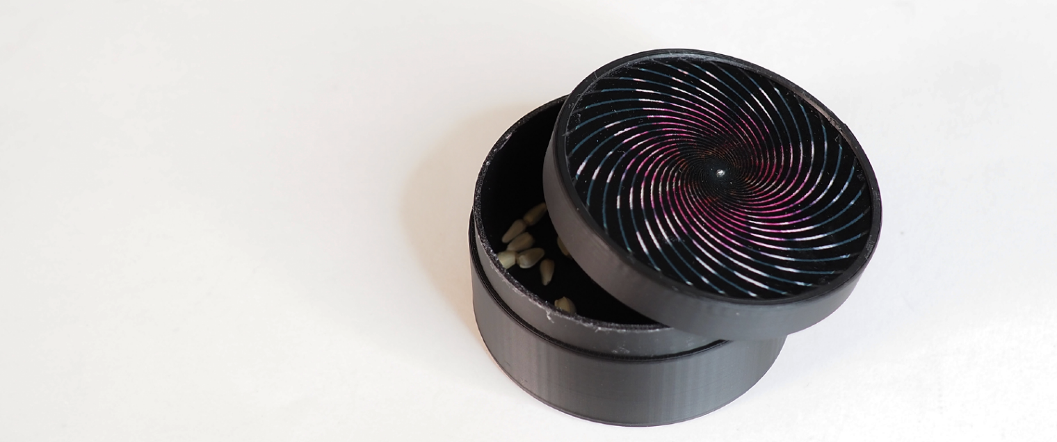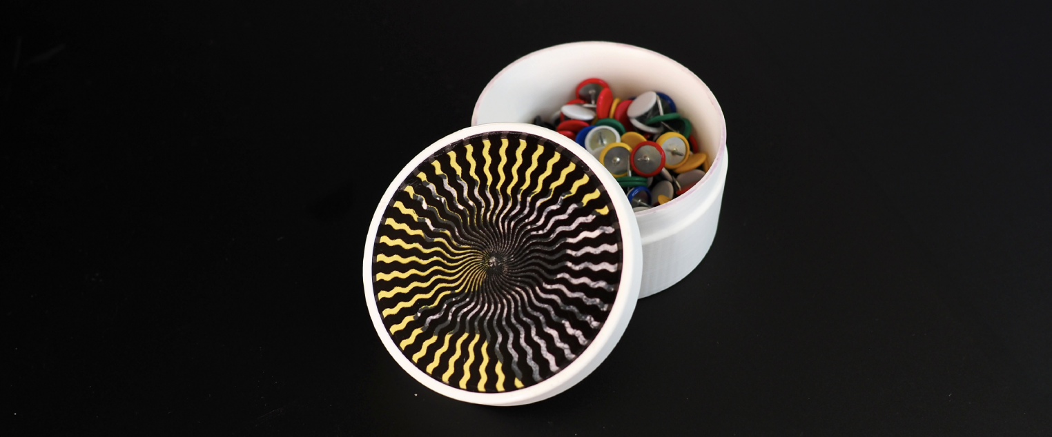 Dynamic Containers. We designed two containers that animate as the user opens them by turning the lids counterclockwise. The first container depicts a three-frame animation of a snapping crocodile (Fig. 17). We stylistically emphasize the crocodile's action by interlacing it with a high frequency sine wave. The second container shows a three-frame animation of a flower gradually opening (Fig. 18). We create a soft spiraling effect that smoothly radiates out from the center by interlacing the frames with a radial function with constant curvature. Despite both using rotational motions, each container conveys a distinct aesthetic through its animation and interlacing pattern. These examples show how animation enhances visual communication in physical designs: a snapping crocodile for a jar of sharp thumb tacks, and a blooming flower for a box of delicate seeds.