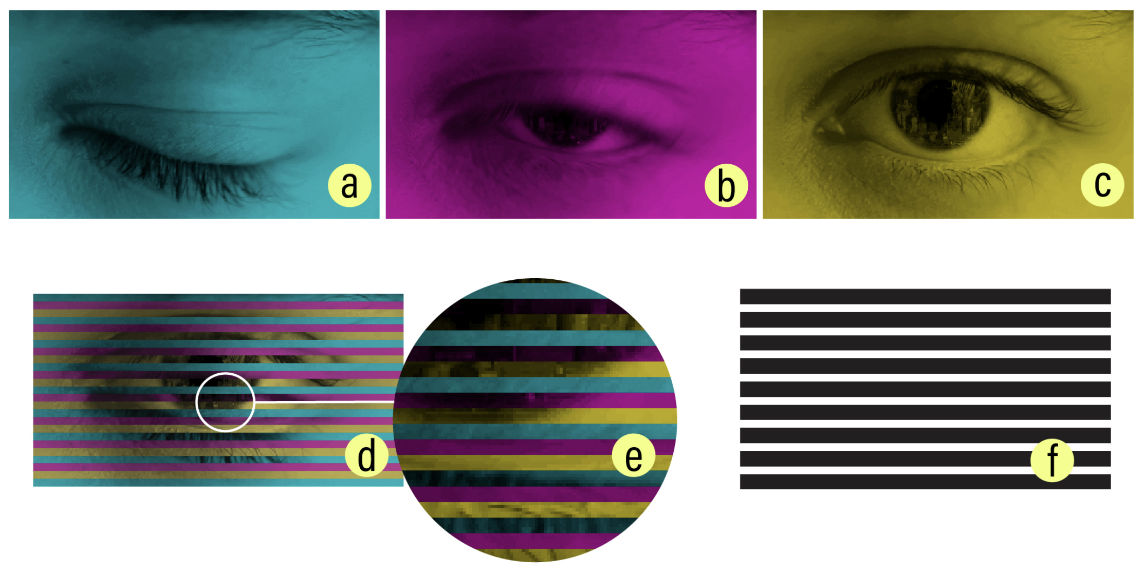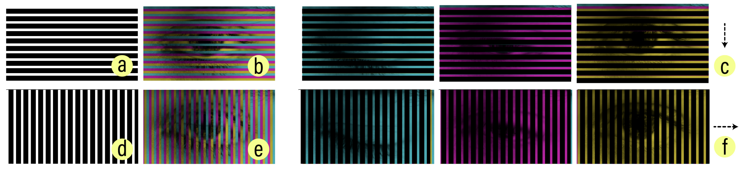 Fundamentally, barrier-grid animations have two components: an interlaced image and a barrier pattern. A barrier represents a striped pattern composed of opaque and transparent regions. An interlaced image is a composite image that encodes an animation sequence by slicing multiple individual frames into equally sized strips and stacking them in an alternating sequence (Fig. 2).