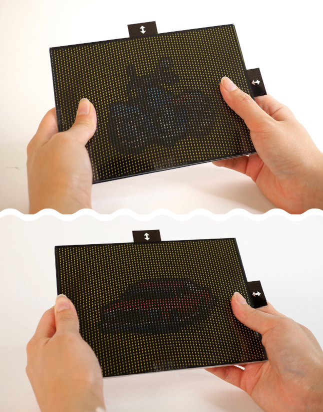 Low-Tech Interfaces. We explored how nested animations can be used as low-tech interfaces that mimic digital interactions. We designed an interactive display that nests two four-frame animations showing quarter-turn views of low-poly car and motorcycle 3D models (Fig. 20). Moving the barriers vertically switches between the two models, while moving horizontally reveals different angles of the selected vehicle. This interaction mimics digital 3D model exploration interfaces, where horizontal dragging orbits around objects and vertical scrolling switches to different views.