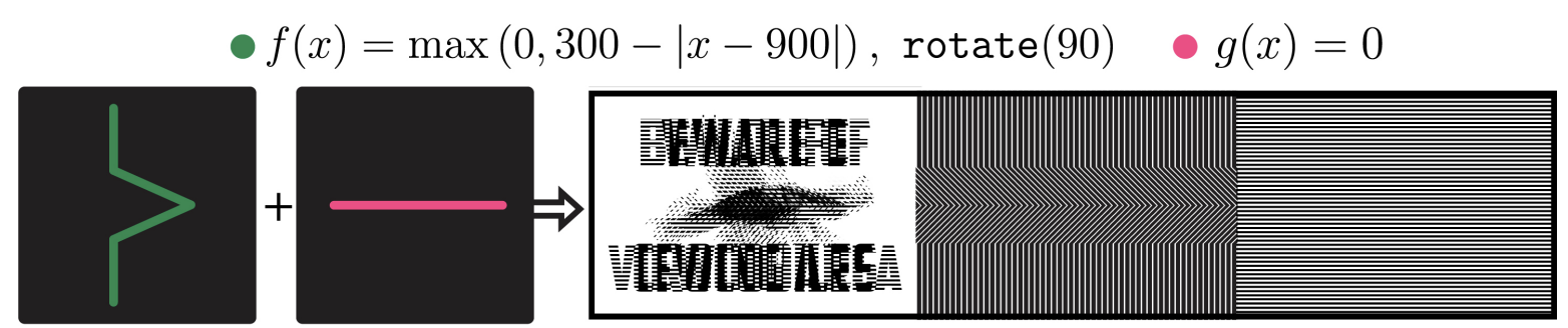 Choosing the Direction of Motion. Since pattern units in rotational animations are stacked along the radial axis, their direction of motion always follows a circular path. Linear animations, on the other hand, allow us to define the direction of motion by rotating pattern units before stacking them (Fig. 8). For example, rotating a constant function \( f(x) = C \) by 90° changes the direction of motion from vertical to horizontal by transforming a horizontal striped barrier into a vertical striped barrier, while rotating by 45° makes the direction of motion diagonal.