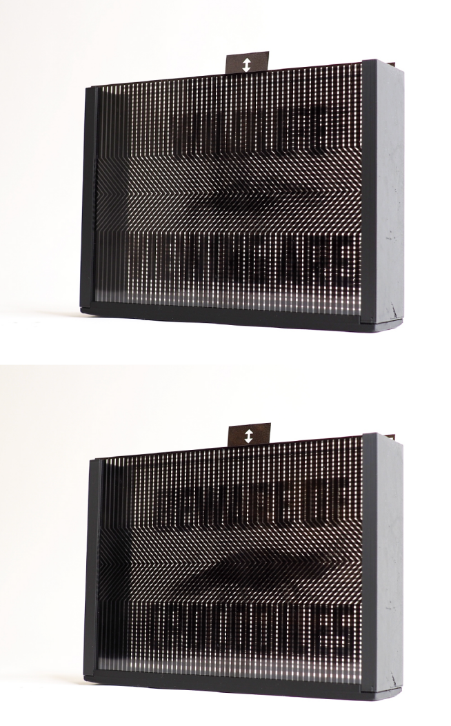 While traditional barrier-grid animations require users to physically slide its constituent components, artists devised a technique that supports view-dependent interactions. View-dependent animations maintain a fixed separation between the interlaced image and barrier layers within a connected structure. As users change their viewing angle—either by repositioning themselves or tilting the structure—the resulting parallax effect produces the same sequential animation as sliding animations (Fig.4).
