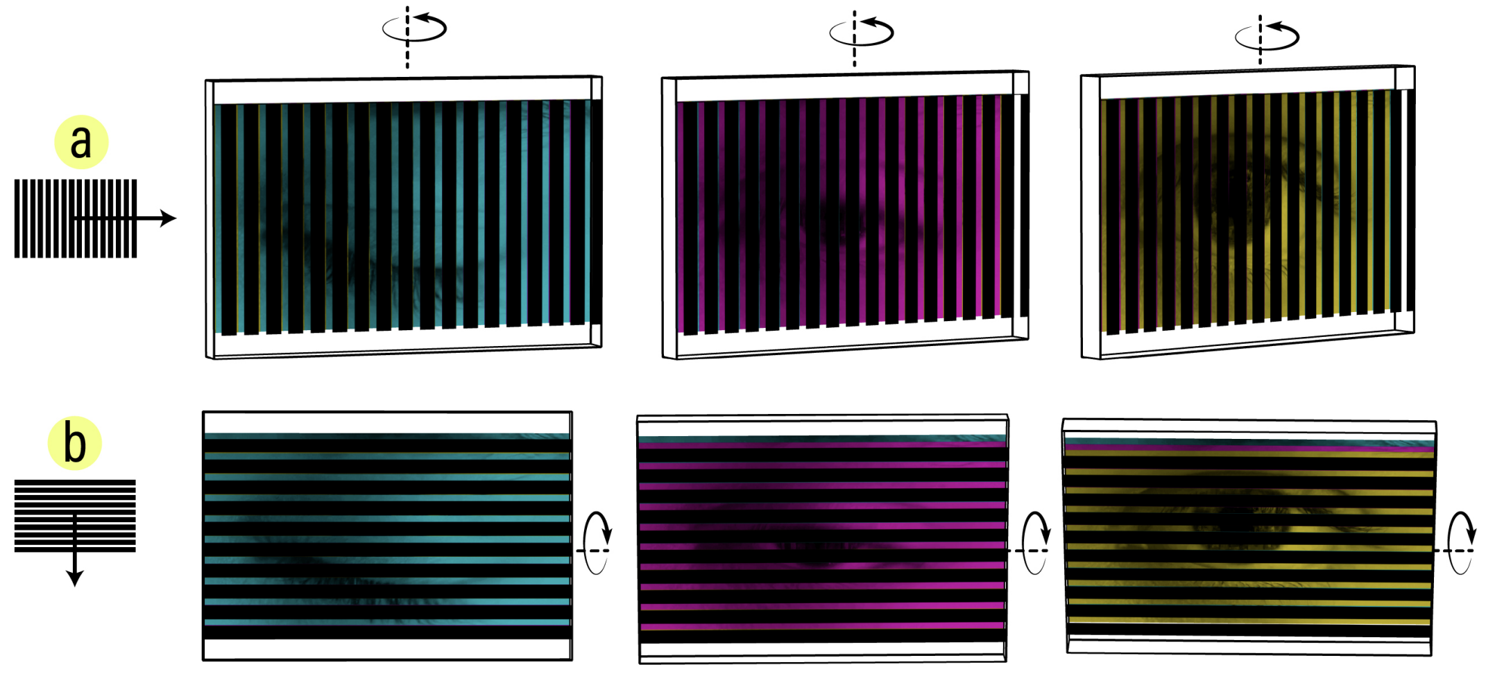 The oldest and most widely-used variant of barrier-grid animations relies on sliding interactions. Typical sliding animations make use of horizontally- or vertically-oriented barriers. The barrier's orientation determines the interlacing direction as well as the primary axis of motion: when a barrier is placed on top of an interlaced image, sliding it along the interlacing direction causes the transparent regions to sequentially reveal different portions of the underlying animation frames (Fig. 3). Continuing to slide the barrier makes the animation loop back to the first frame after revealing the last.