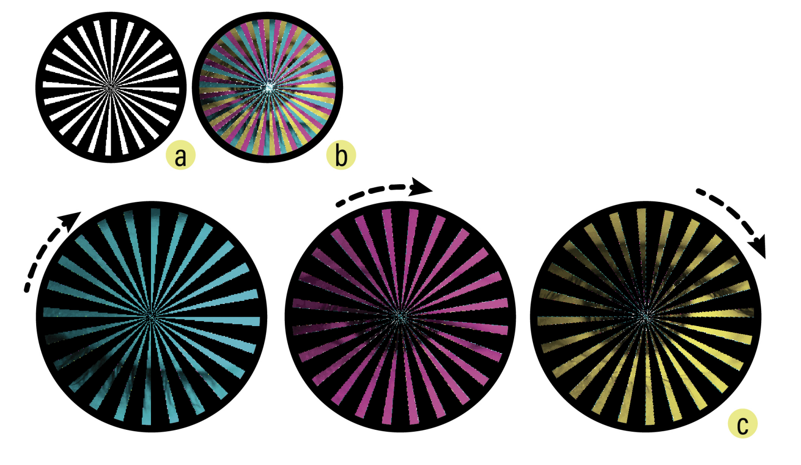 As previously discussed, the barrier orientation and corresponding interlacing direction determine the animation's direction of motion. Whereas sliding and view-dependent animations are linearly interlaced along the x or y axes, we can also perform radial interlacing along the polar axis. This yields a construction that facilitates rotational interactions. Under this scheme, the barrier pattern and interlaced image have radial symmetry and comprise wedge-shaped segments that extend from the center (Fig. 5). Rotating a barrier clockwise around the center advances the underlying animation.
