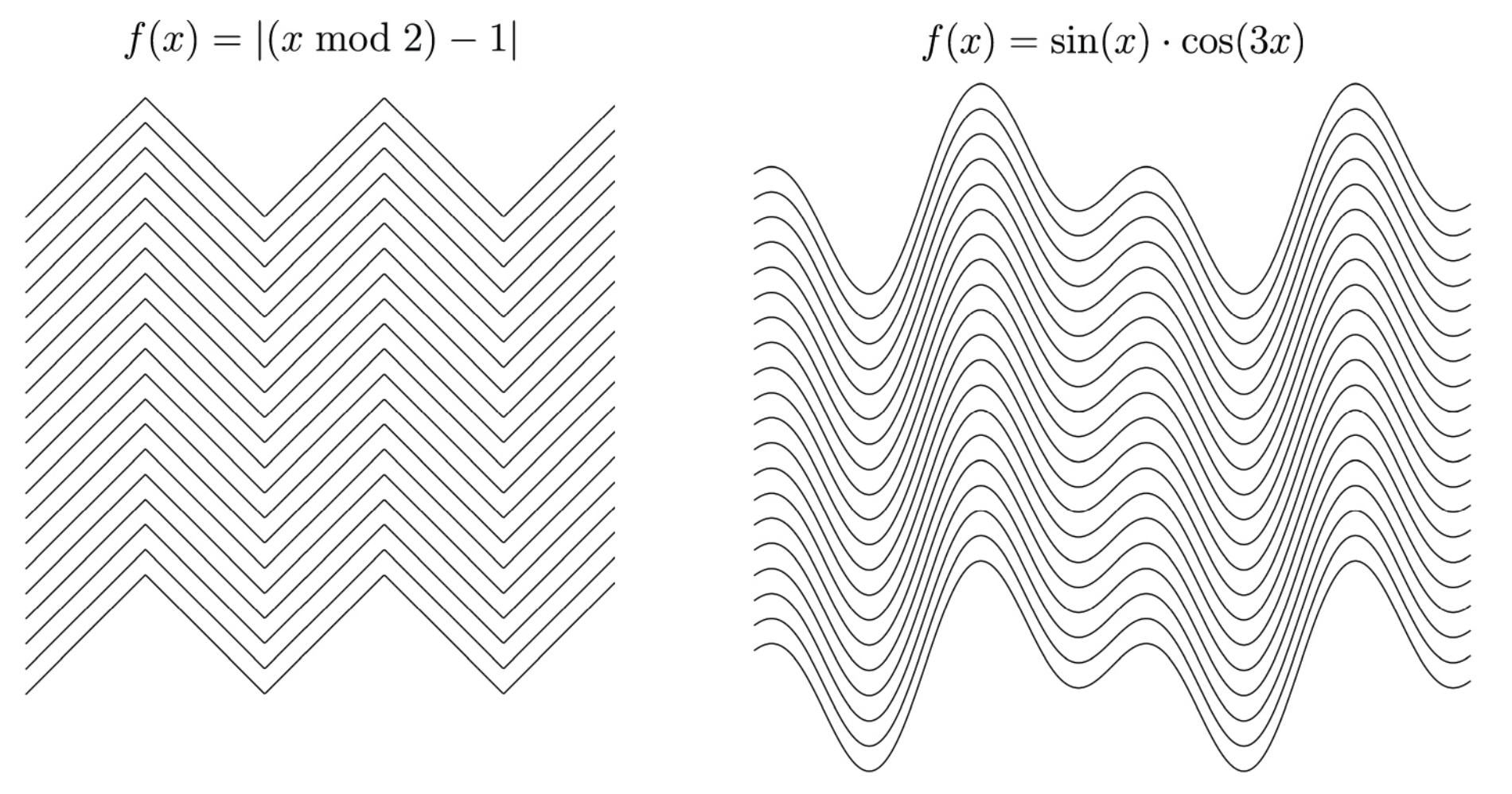 Conveniently, this mapping between valid interlaced strips and functions allows us to parameterize our pattern unit with any mathematical function \( f \) that describes its path as it moves along the x-axis (Fig. 6). For example, the function \( f(x) = C \) (where C is a constant) creates straight horizontal lines, while \( f(x) = \sin(x) \) produces a wavy pattern.